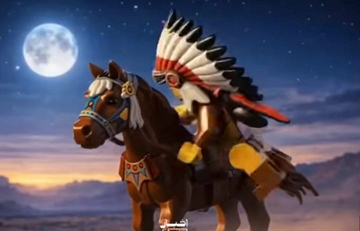 What’s interesting is that these films also speak to the non-MAGA Americans as well as the global community by framing Iran as standing up for all those harmed by American Imperialism. In these images, though we see much of American propaganda returned to us, reframed. Trump has been busy strong arming Smithsonian to reframe narratives and adding Prager U into schools to move education back to the 1950s in ways of discussing slavery and Native Americans. In each, they’d love to absolve white Americans and validate their belief that merit is the only reason white people have succeeded in this nation. By leaning into imagery, like the noble savage, these videos confront the lie that the Trump Administration runs on—that it was better before.