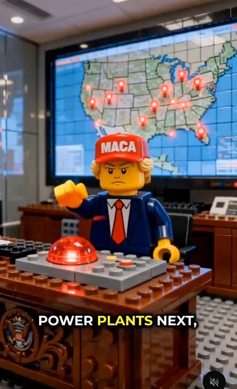 The LEGO slopaganda are also aiming at Trump’s faithful in another way—fear. MAGA is largely fueled by fear. This sector is the least educated and most likely to be part of a religious group. They’ve been programmed by FOX and the Internet to react to change by being reactionary rather than proactive. These films use the same type of fear to show the consequences of Trump’s actions—basically, the tanking of the dollar, the destruction of the government and Trump’s legacy, and the toppling of the American way of life.